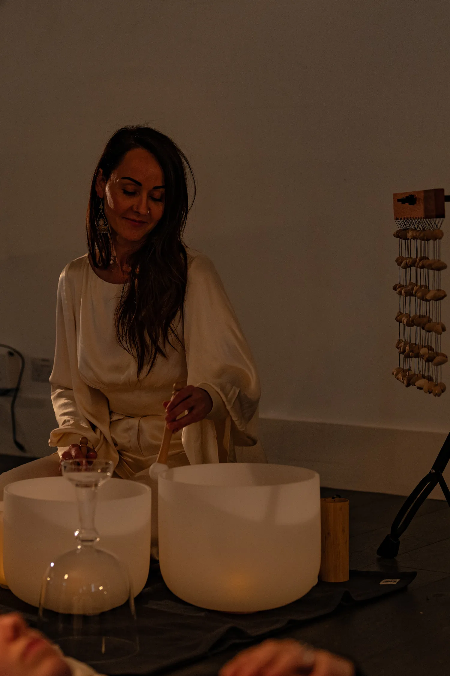 The harmonious vibrations from instruments such as crystal singing bowls, drums and chimes work to relax the nervous system and slow down brain waves, inducing the relaxation response, promoting a meditative state that encourages deep rest, mindfulness, and tranquillity.